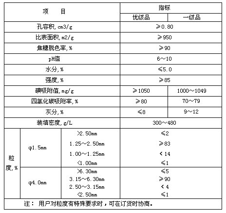 一般在水处理中使用的活性炭,其表面积不一定过大,但是应具有较多的过渡孔隙及较大的平均孔徑。日本市埸售一些液相用的活性炭具有以下特性:比表面积为850至1000m2/g,孔隙容积为0.88至1.5ml/g,平均孔隙半径為40至50A。